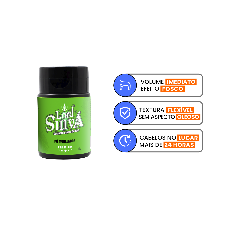 Cabelo murcho nunca mais. O Pó Modelador da Lordshiva dá volume instantâneo com efeito matte e textura leve, sem brilho ou oleosidade. Adere na raiz, estrutura o penteado e garante fixação firme com aparência natural. Ideal pra fios finos ou oleosos. Resultado limpo, potente e discreto — em segundos.