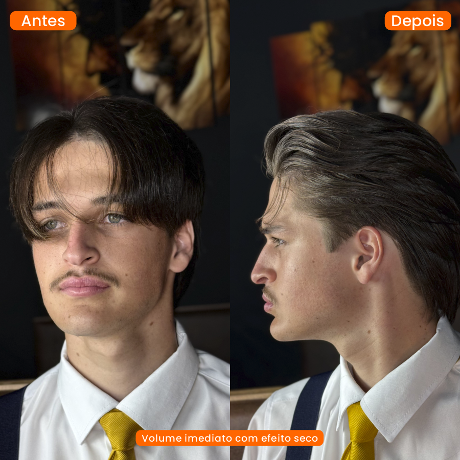 Não. O Pó Modelador da Lordshiva é ultrafino e se integra facilmente aos fios. Quando aplicado na medida certa e espalhado com as mãos, ele desaparece visualmente, deixando apenas o efeito de volume seco e natural, sem resíduos aparentes — até mesmo em cabelos escuros.